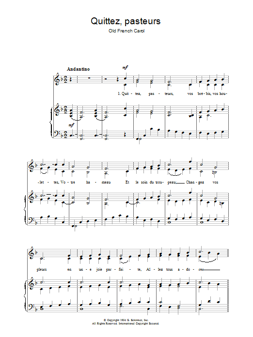 Download or print Christmas Carol Quittez Pasteurs sheet music, chords and digital score arranged for Piano, Vocal & Guitar Chords. This Christmas score includes 2 page(s).