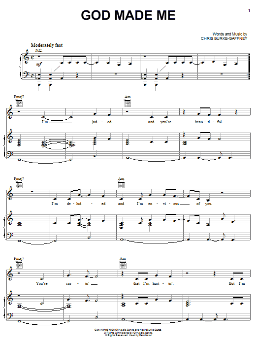 Download or print Chantal Kreviazuk God Made Me sheet music, chords and digital score arranged for Piano, Vocal & Guitar Chords (Right-Hand Melody). This Pop score includes 6 page(s).