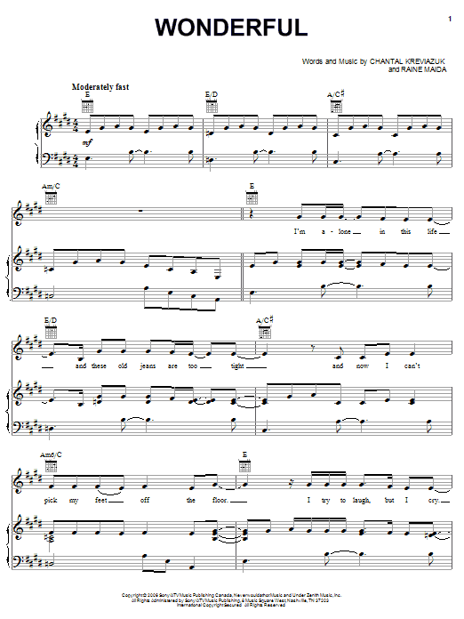 Download or print Chantal Kreviazuk Wonderful sheet music, chords and digital score arranged for Piano, Vocal & Guitar Chords (Right-Hand Melody). This Pop score includes 9 page(s).