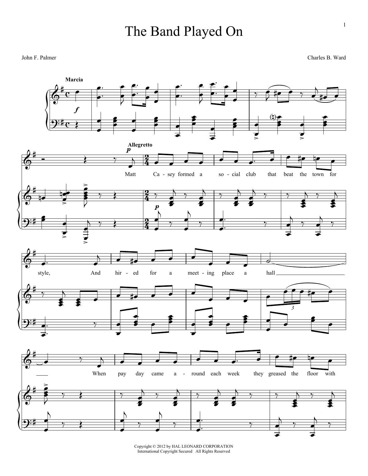 Download or print Charles B. Ward The Band Played On sheet music, chords and digital score arranged for Piano & Vocal. This Folk score includes 4 page(s).