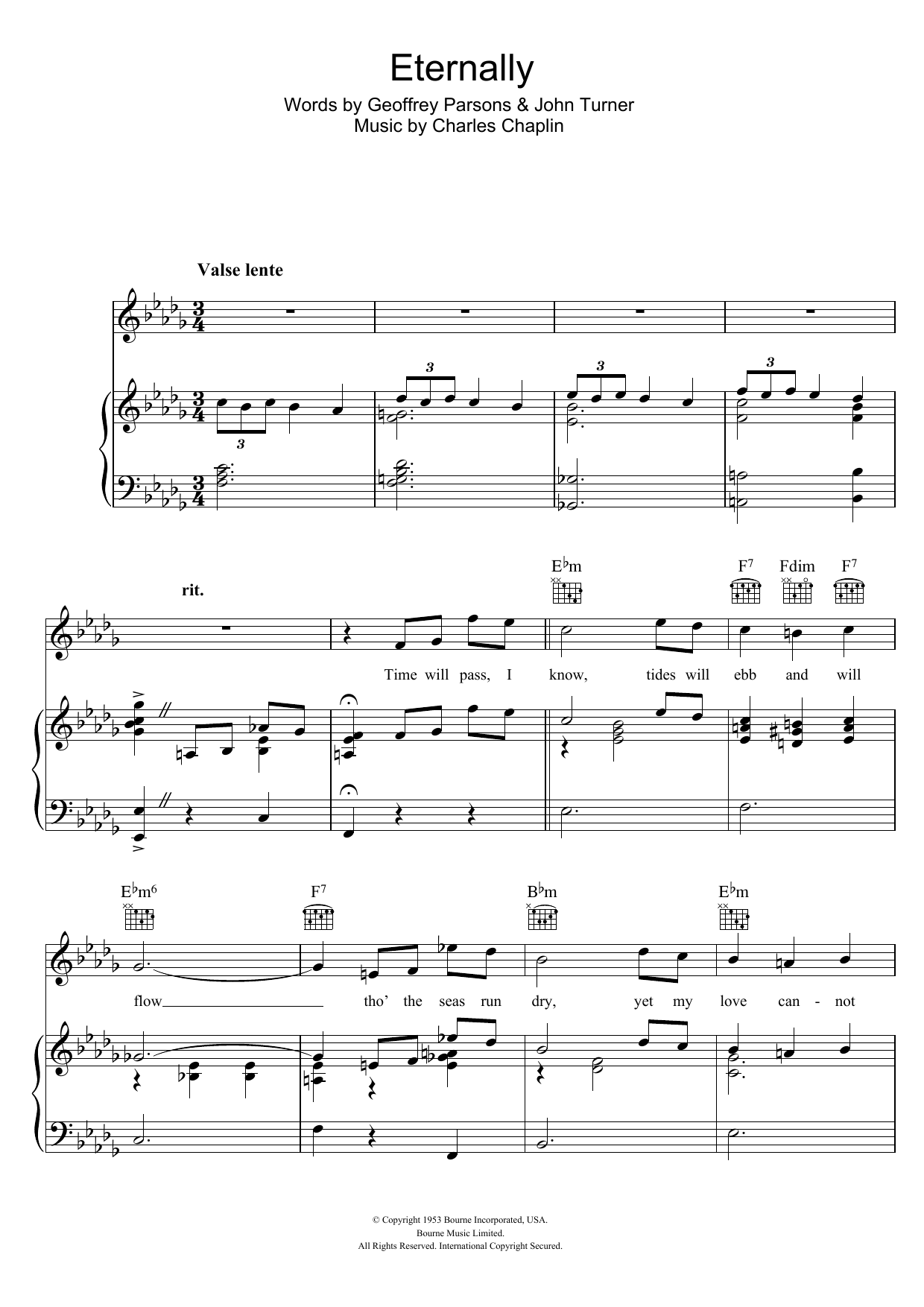 Download or print Charles Chaplin Eternally sheet music, chords and digital score arranged for Piano, Vocal & Guitar Chords. This Film/TV score includes 4 page(s).