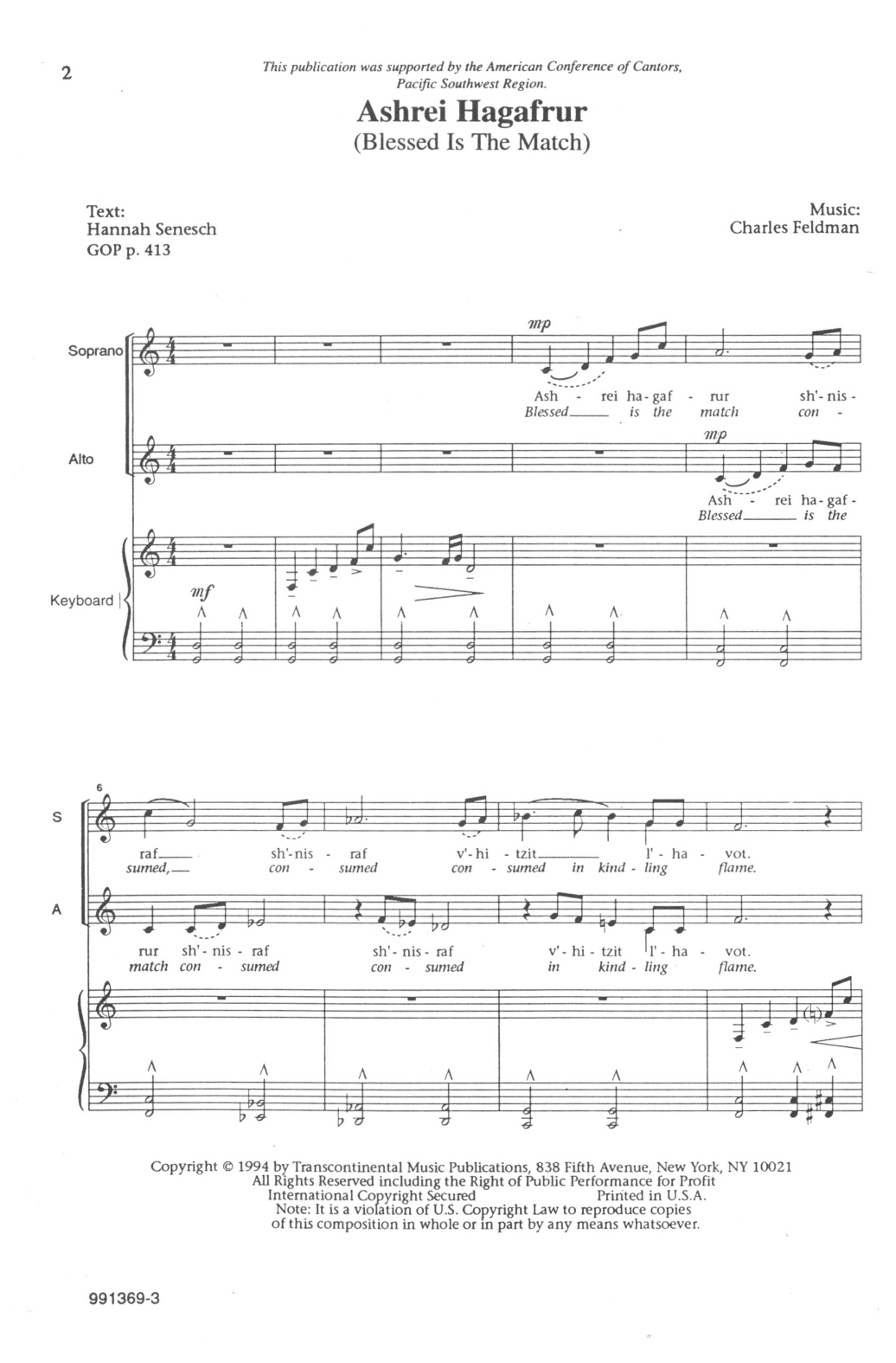 Download or print Charles Feldman Ashrei Hagafrur (Blessed Is The Match) sheet music, chords and digital score arranged for 2-Part Choir. This Jewish score includes 3 page(s).