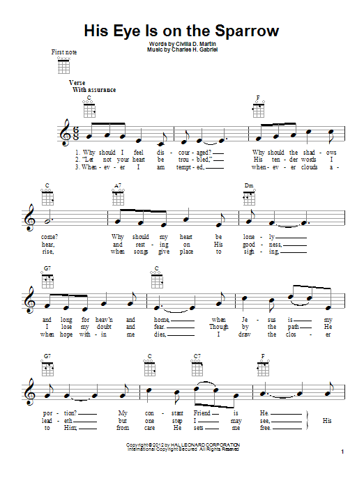 Download or print Charles H. Gabriel His Eye Is On The Sparrow sheet music, chords and digital score arranged for Piano, Vocal & Guitar Chords (Right-Hand Melody). This Gospel score includes 2 page(s).