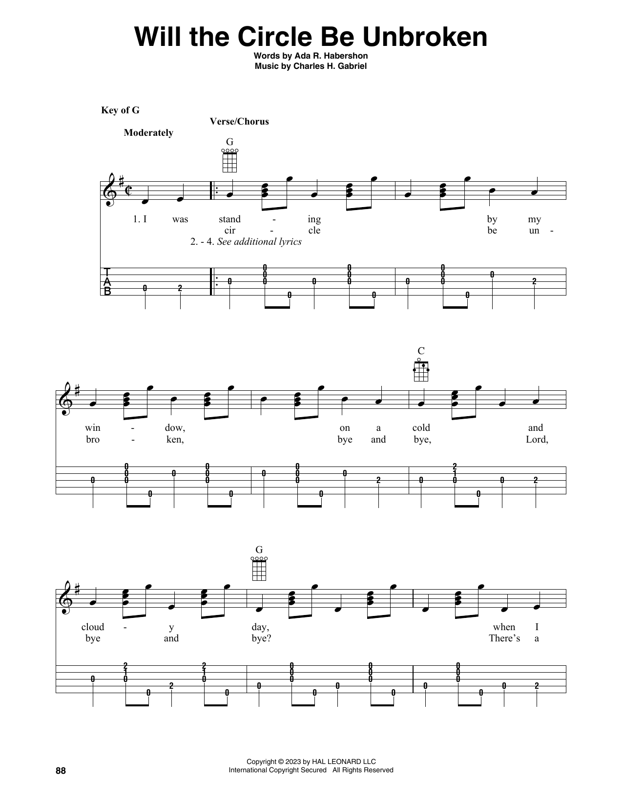 Download or print Charles H. Gabriel Will The Circle Be Unbroken (arr. Fred Sokolow) sheet music, chords and digital score arranged for Banjo Tab. This Gospel score includes 2 page(s).