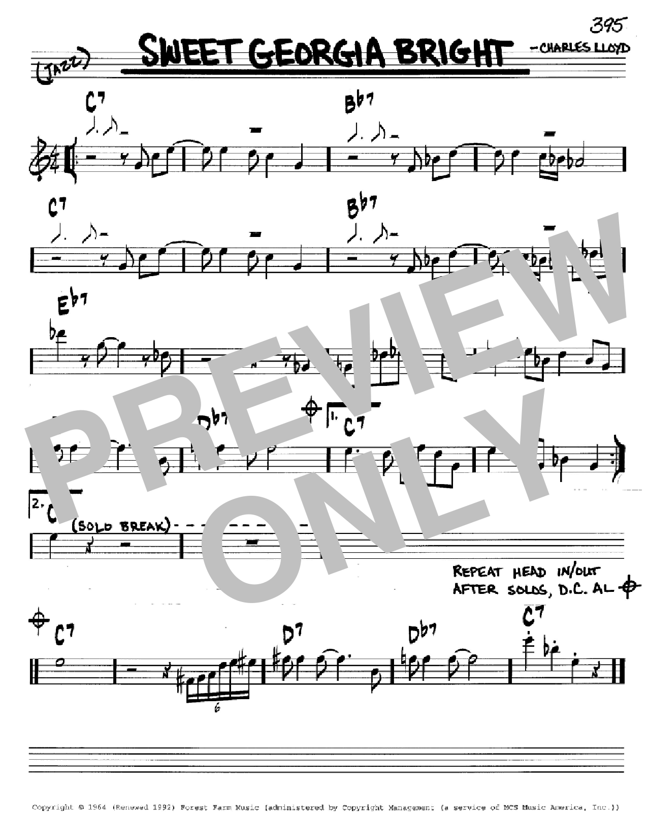 Download or print Charles Lloyd Sweet Georgia Bright sheet music, chords and digital score arranged for Real Book – Melody & Chords – C Instruments. This Jazz score includes 1 page(s).