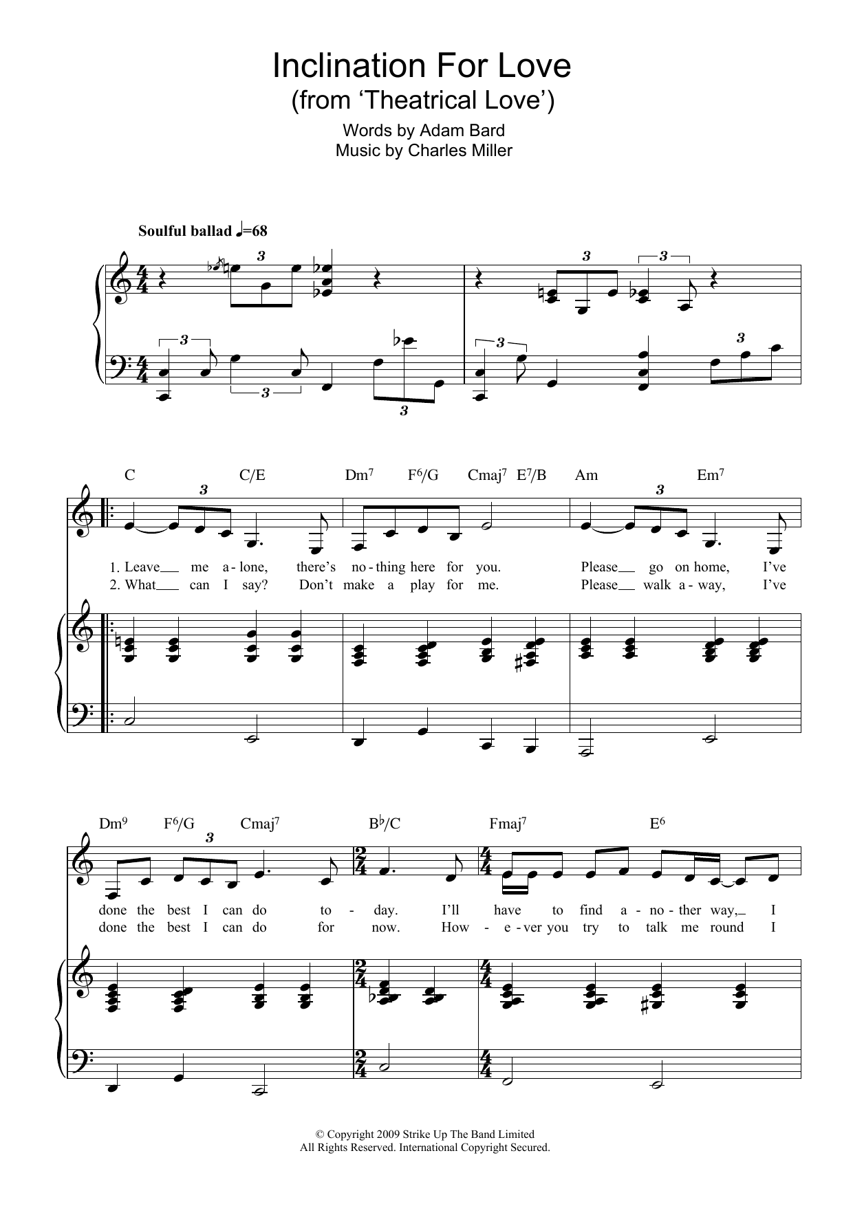 Download or print Charles Miller Inclination For Love (from Theatrical Love) sheet music, chords and digital score arranged for Piano & Vocal. This Musical/Show score includes 5 page(s).