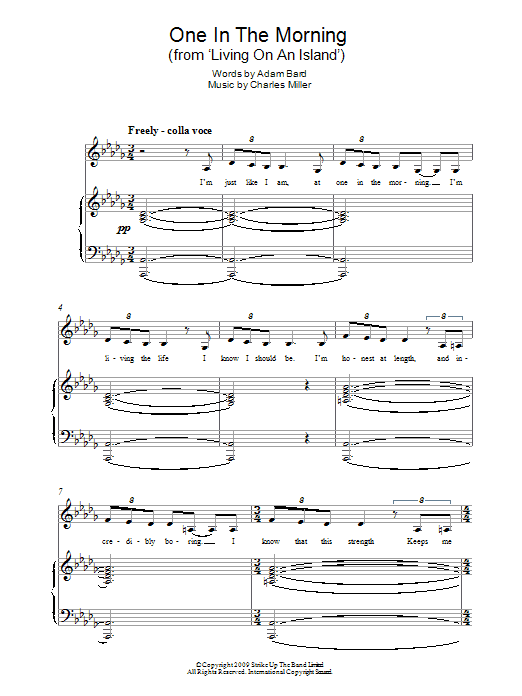 Download or print Charles Miller & Adam Bard One In The Morning (from Living On An Island) sheet music, chords and digital score arranged for Piano & Vocal. This Musical/Show score includes 8 page(s).