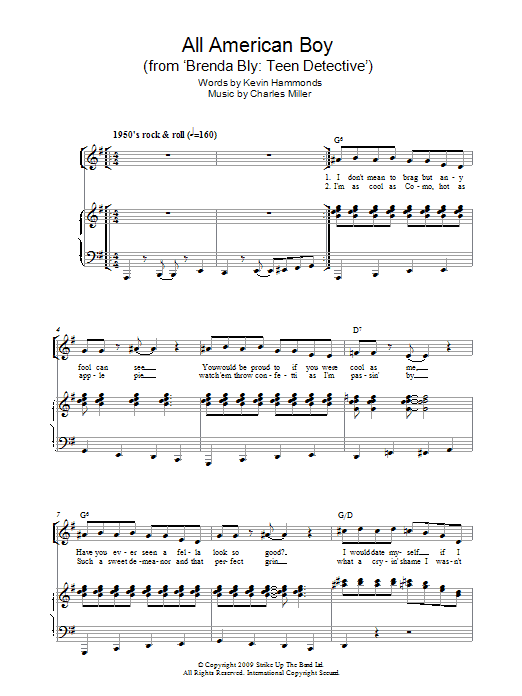 Download or print Charles Miller & Kevin Hammonds All American Boy (from Brenda Bly: Teen Detective) sheet music, chords and digital score arranged for Piano & Vocal. This Musical/Show score includes 8 page(s).