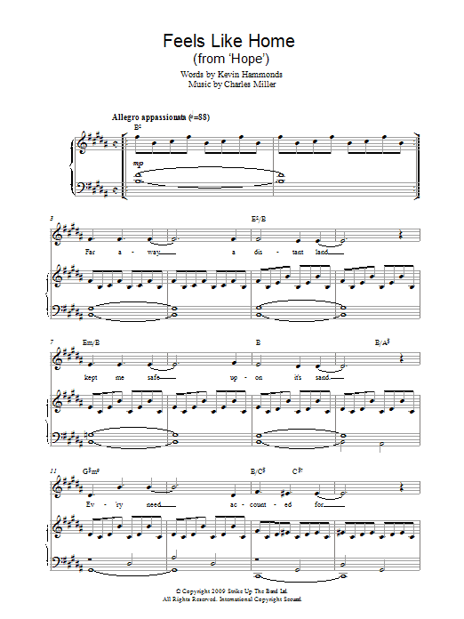Download or print Charles Miller & Kevin Hammonds Feels Like Home (from Hope) sheet music, chords and digital score arranged for Piano & Vocal. This Musical/Show score includes 8 page(s).