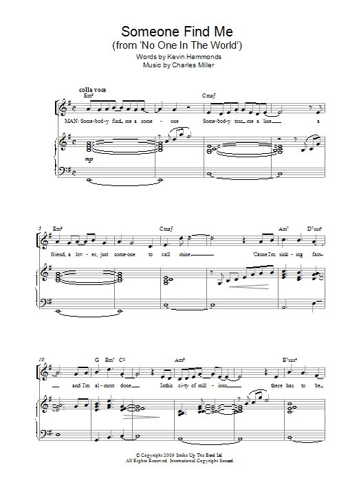 Download or print Charles Miller & Kevin Hammonds Someone Find Me (from No One In The World) sheet music, chords and digital score arranged for Piano & Vocal. This Musical/Show score includes 8 page(s).