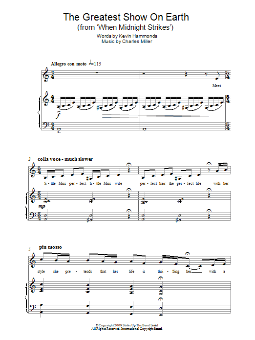 Download or print Charles Miller & Kevin Hammonds The Greatest Show On Earth (from When Midnight Strikes) sheet music, chords and digital score arranged for Piano & Vocal. This Musical/Show score includes 10 page(s).