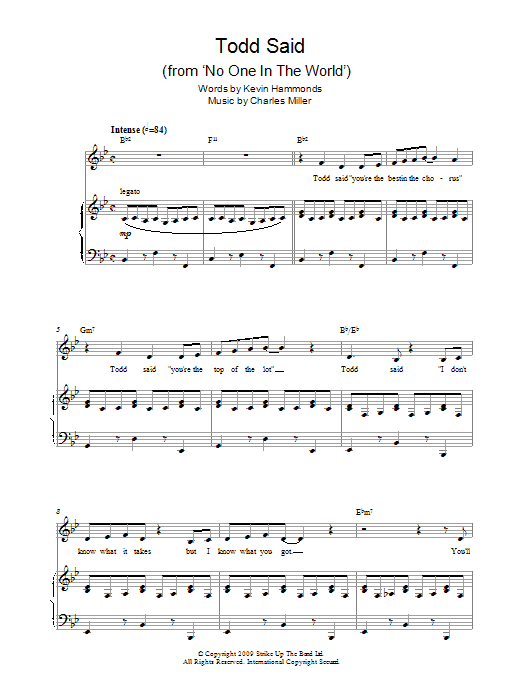 Download or print Charles Miller & Kevin Hammonds Todd Said (from No One In The World) sheet music, chords and digital score arranged for Piano & Vocal. This Musical/Show score includes 6 page(s).