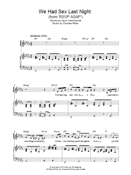 Download or print Charles Miller & Kevin Hammonds We Had Sex Last Night (from RSVP ASAP) sheet music, chords and digital score arranged for Piano & Vocal. This Musical/Show score includes 8 page(s).