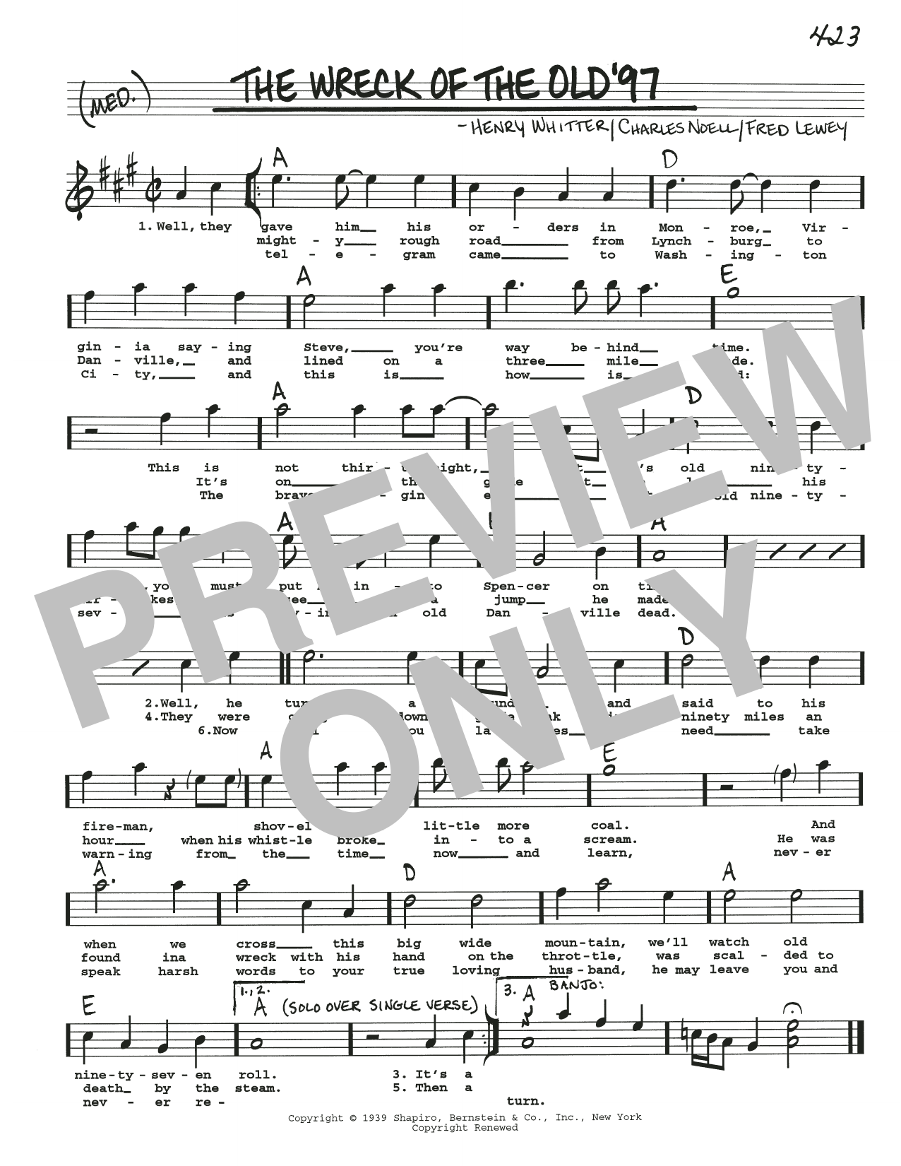Download or print Charles Noell The Wreck Of The Old '97 sheet music, chords and digital score arranged for Real Book – Melody, Lyrics & Chords. This Folk score includes 1 page(s).