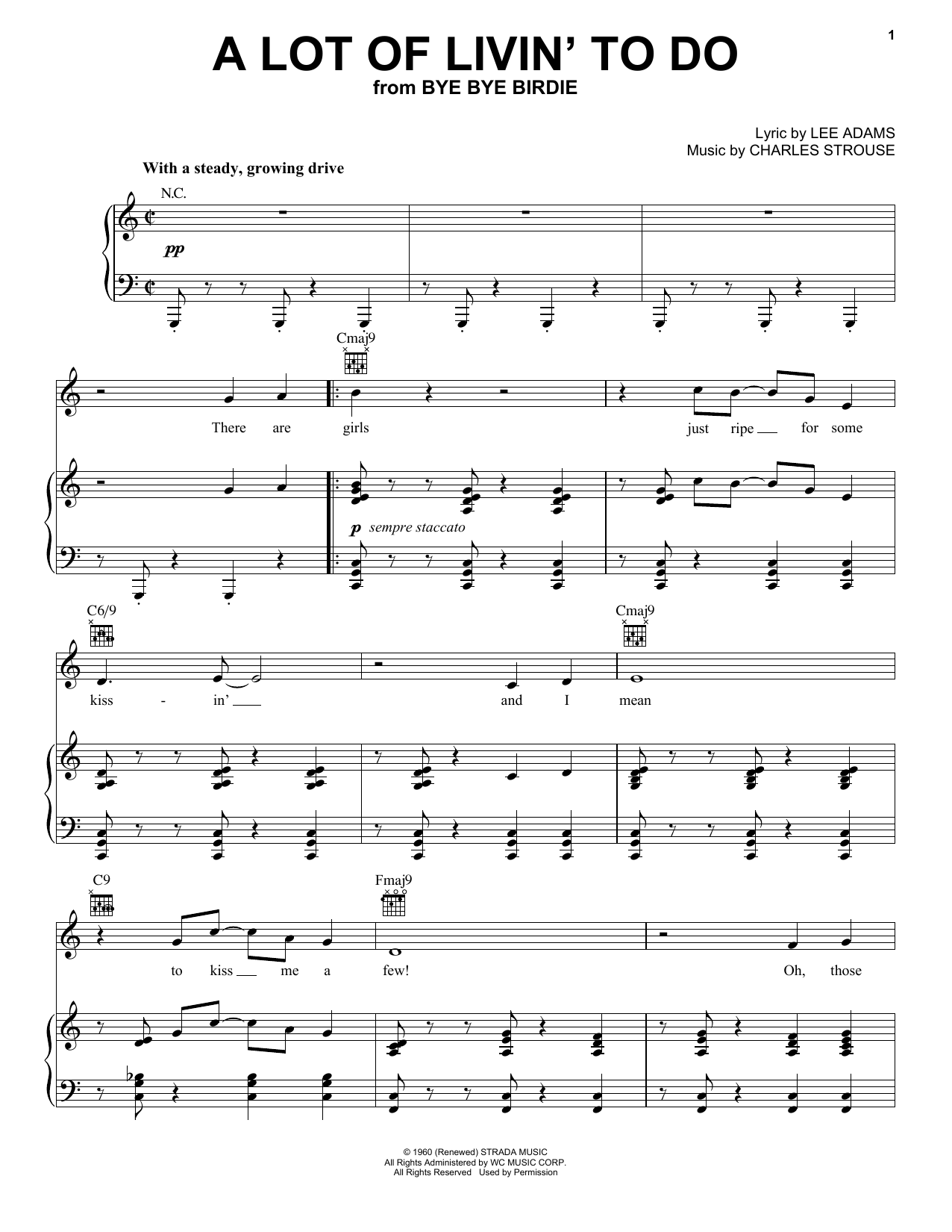 Download or print Charles Strouse A Lot Of Livin' To Do sheet music, chords and digital score arranged for Piano, Vocal & Guitar Chords (Right-Hand Melody). This Film/TV score includes 6 page(s).