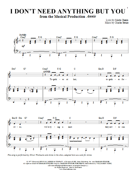Download or print Charles Strouse I Don't Need Anything But You sheet music, chords and digital score arranged for Piano & Vocal. This Children score includes 5 page(s).