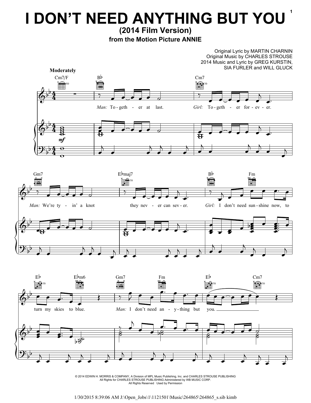 Download or print Charles Strouse I Don't Need Anything But You (2014 Film Version) sheet music, chords and digital score arranged for Piano, Vocal & Guitar Chords (Right-Hand Melody). This Musical/Show score includes 6 page(s).