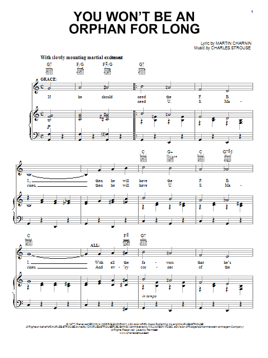 Download or print Charles Strouse You Won't Be An Orphan For Long sheet music, chords and digital score arranged for Piano, Vocal & Guitar Chords (Right-Hand Melody). This Broadway score includes 3 page(s).
