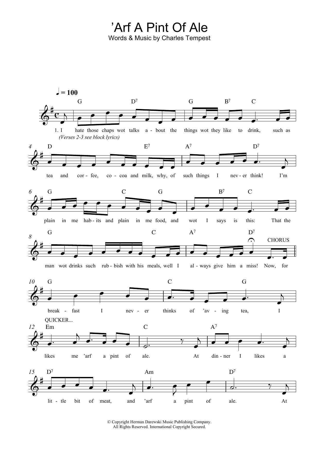 Download or print Charles Tempest 'Arf A Pint Of Ale sheet music, chords and digital score arranged for Lead Sheet / Fake Book. This Traditional score includes 2 page(s).