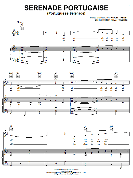 Download or print Charles Trenet Serenade Portugaise sheet music, chords and digital score arranged for Piano, Vocal & Guitar Chords (Right-Hand Melody). This French score includes 6 page(s).