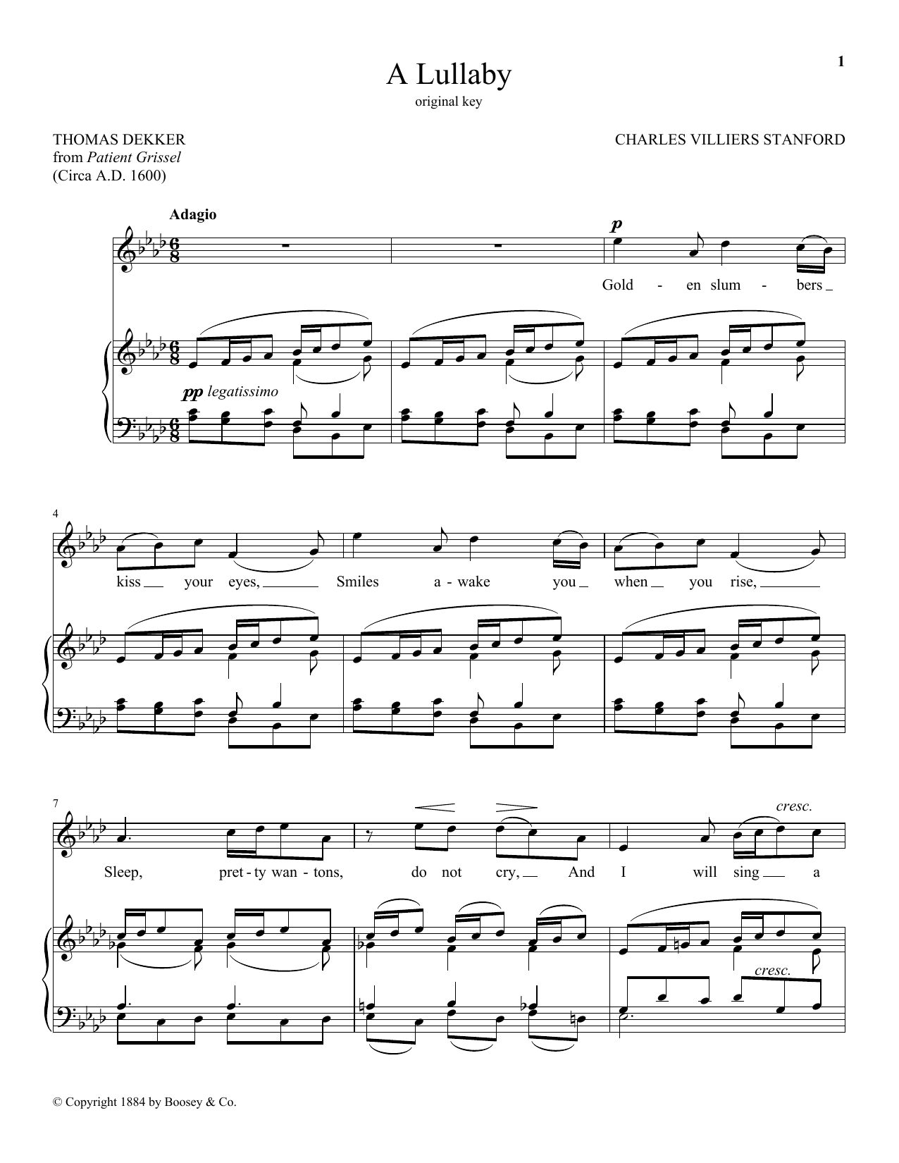 Download or print Charles Villiers Stanford A Lullaby sheet music, chords and digital score arranged for Piano & Vocal. This Classical score includes 3 page(s).
