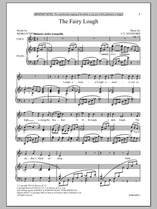 Download or print Charles Villiers Stanford The Fairy Lough sheet music, chords and digital score arranged for Piano & Vocal. This Classical score includes 5 page(s).