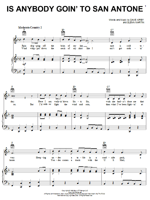 Download or print Charley Pride Is Anybody Goin' To San Antone sheet music, chords and digital score arranged for Piano, Vocal & Guitar Chords (Right-Hand Melody). This Country score includes 2 page(s).