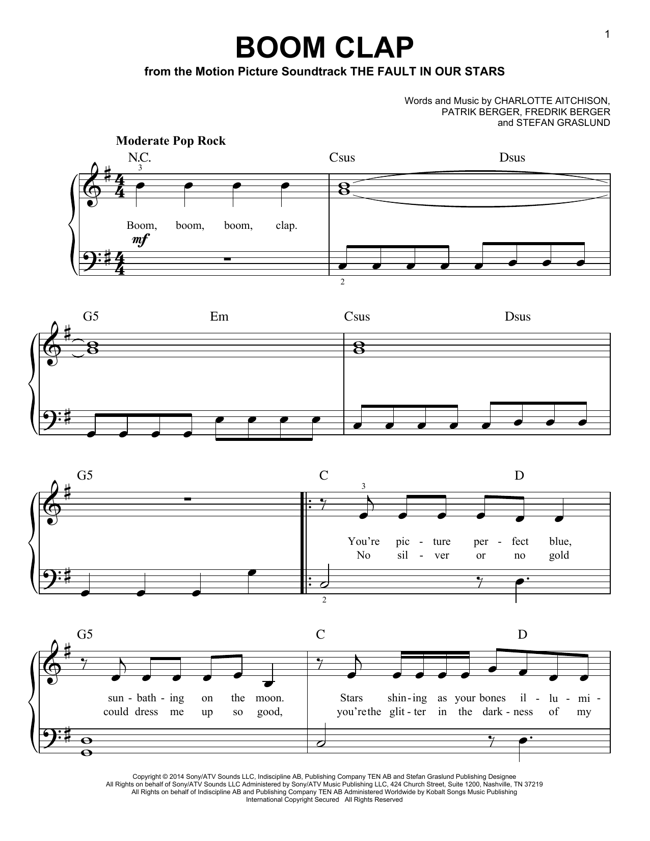 Download or print Charli XCX Boom Clap sheet music, chords and digital score arranged for Easy Piano. This Pop score includes 5 page(s).