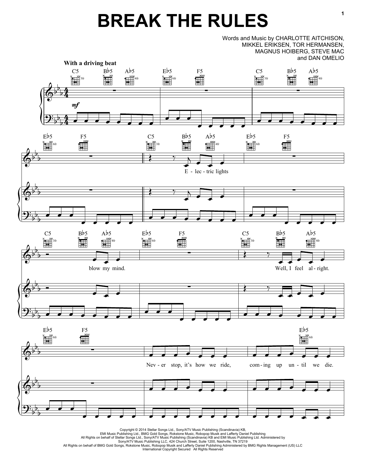 Download or print Charli XCX Break The Rules sheet music, chords and digital score arranged for Piano, Vocal & Guitar Chords (Right-Hand Melody). This Pop score includes 7 page(s).