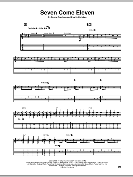 Download or print Charlie Christian Seven Come Eleven sheet music, chords and digital score arranged for Guitar Tab. This Jazz score includes 3 page(s).