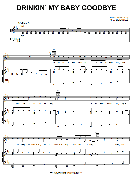 Download or print Charlie Daniels Band Drinkin' My Baby Goodbye sheet music, chords and digital score arranged for Piano, Vocal & Guitar Chords (Right-Hand Melody). This Country score includes 6 page(s).