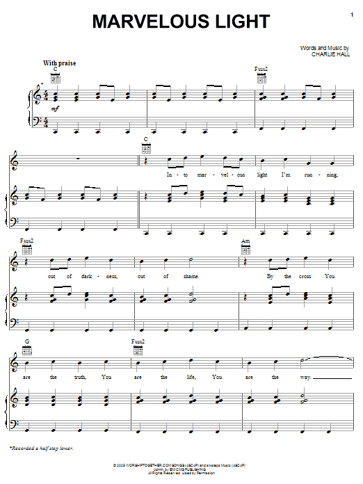Download or print Charlie Hall Marvelous Light sheet music, chords and digital score arranged for Piano, Vocal & Guitar Chords (Right-Hand Melody). This Christian score includes 6 page(s).