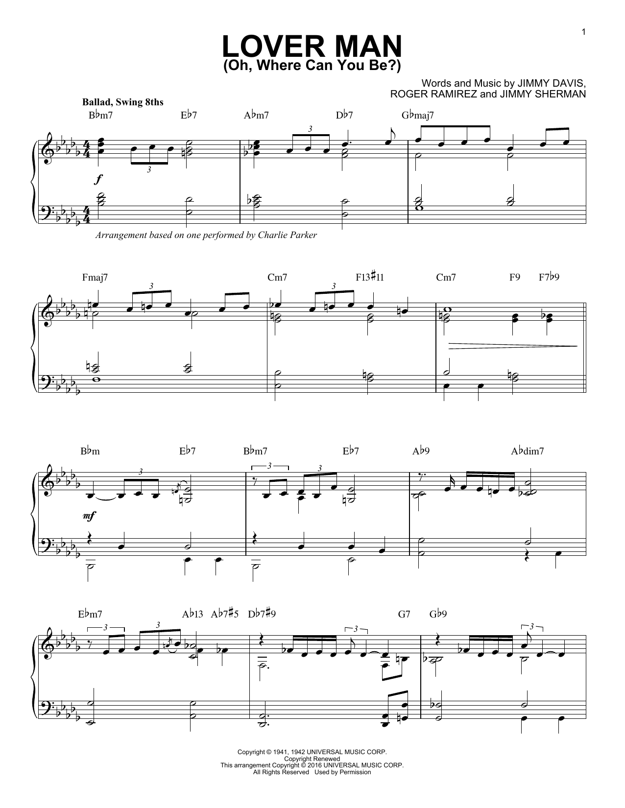 Download or print Charlie Parker Lover Man (Oh, Where Can You Be?) (arr. Brent Edstrom) sheet music, chords and digital score arranged for Piano Solo. This Jazz score includes 4 page(s).