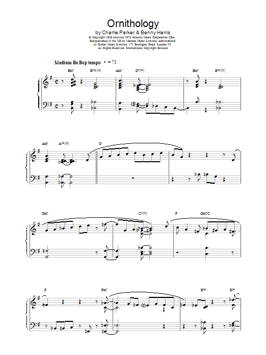 Download or print Charlie Parker Ornithology sheet music, chords and digital score arranged for Real Book – Melody & Chords – C Instruments. This Jazz score includes 1 page(s).