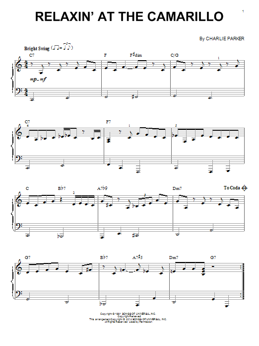Download or print Charlie Parker Relaxin' At The Camarillo sheet music, chords and digital score arranged for Alto Sax Transcription. This Jazz score includes 2 page(s).