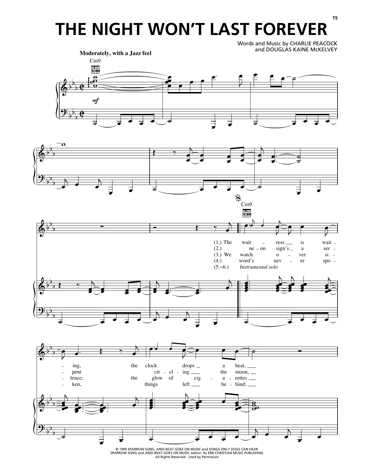 Download or print Charlie Peacock The Night Won't Last Forever sheet music, chords and digital score arranged for Piano, Vocal & Guitar Chords (Right-Hand Melody). This Pop score includes 5 page(s).