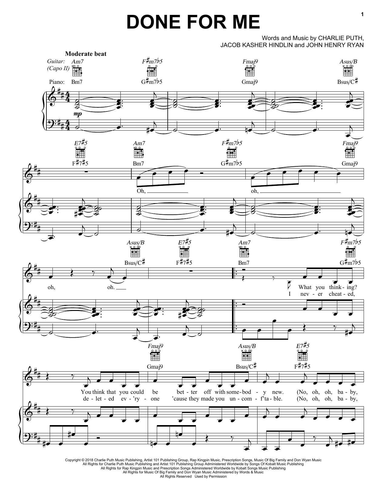 Download or print Charlie Puth Done For Me (feat. Kehlani) sheet music, chords and digital score arranged for Piano, Vocal & Guitar Chords (Right-Hand Melody). This Pop score includes 4 page(s).