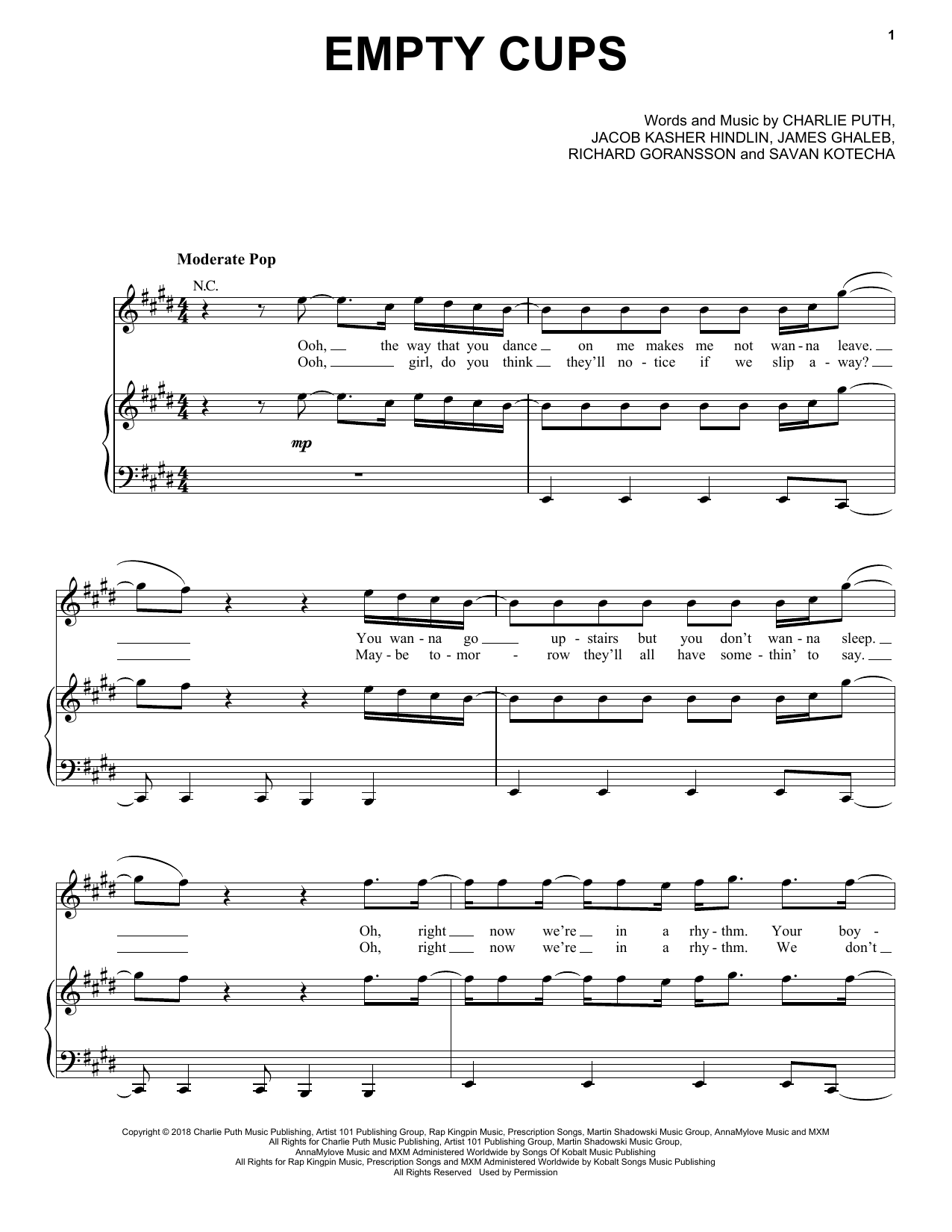 Download or print Charlie Puth Empty Cups sheet music, chords and digital score arranged for Piano, Vocal & Guitar Chords (Right-Hand Melody). This Pop score includes 5 page(s).