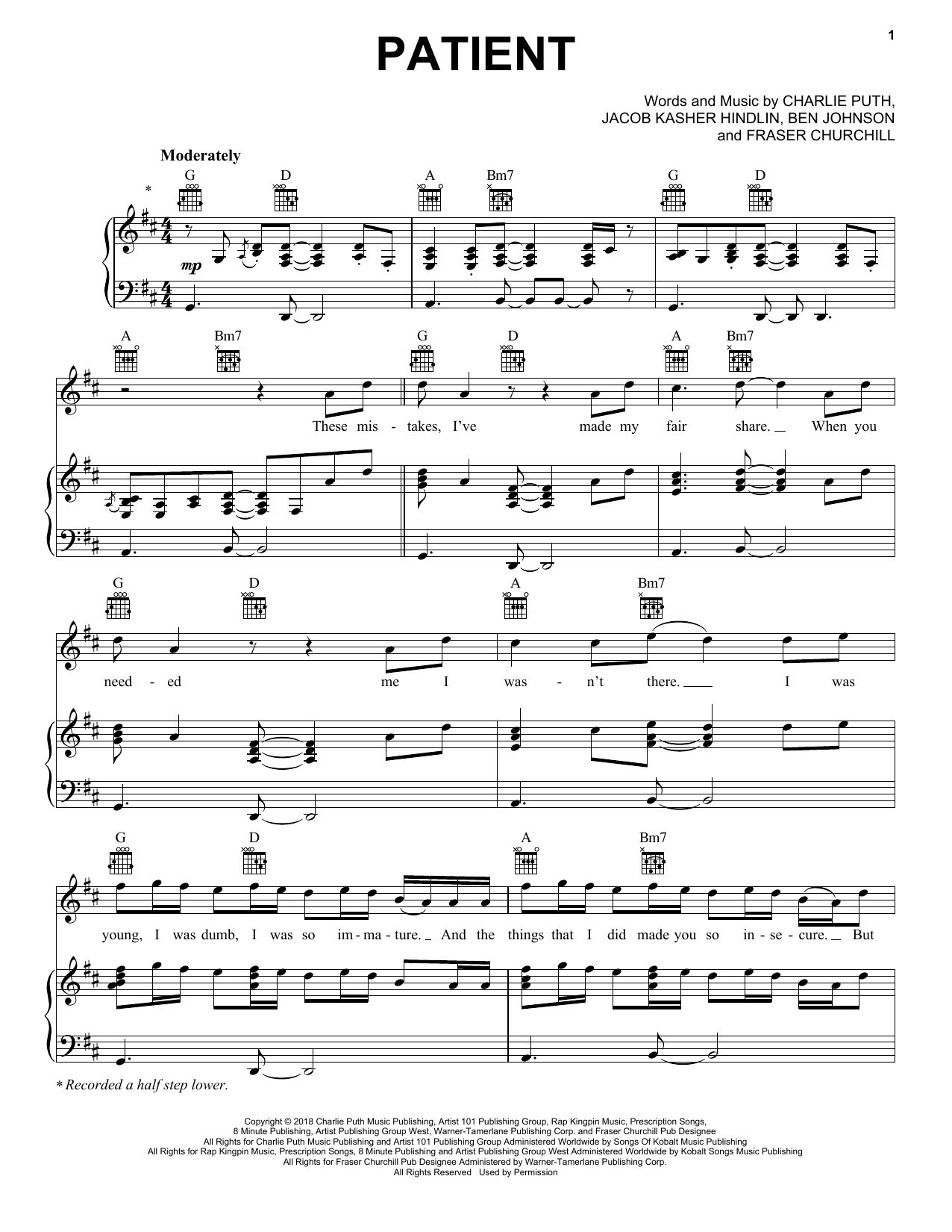 Download or print Charlie Puth Patient sheet music, chords and digital score arranged for Piano, Vocal & Guitar Chords (Right-Hand Melody). This Pop score includes 6 page(s).