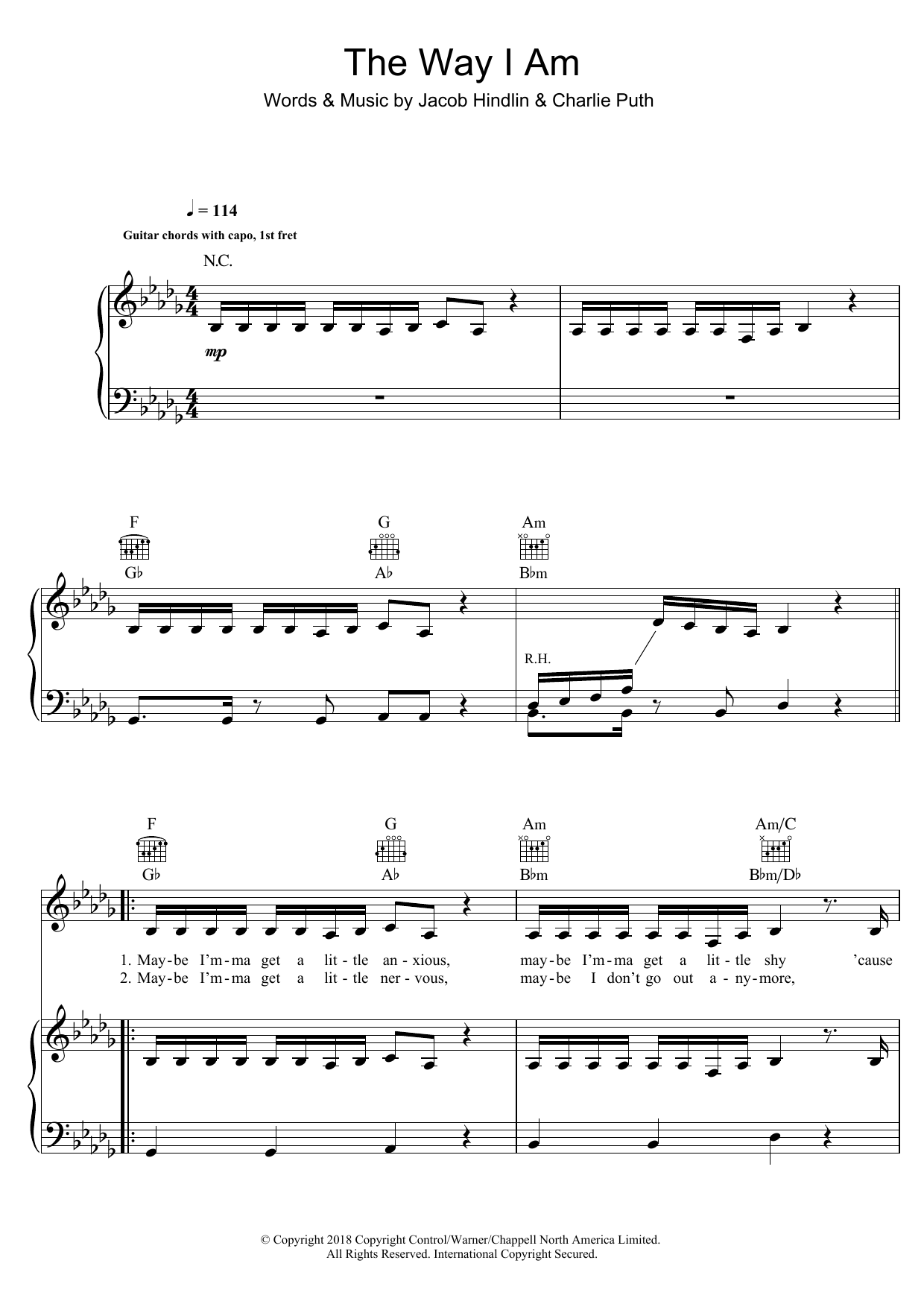 Download or print Charlie Puth The Way I Am sheet music, chords and digital score arranged for Piano, Vocal & Guitar Chords. This Pop score includes 6 page(s).