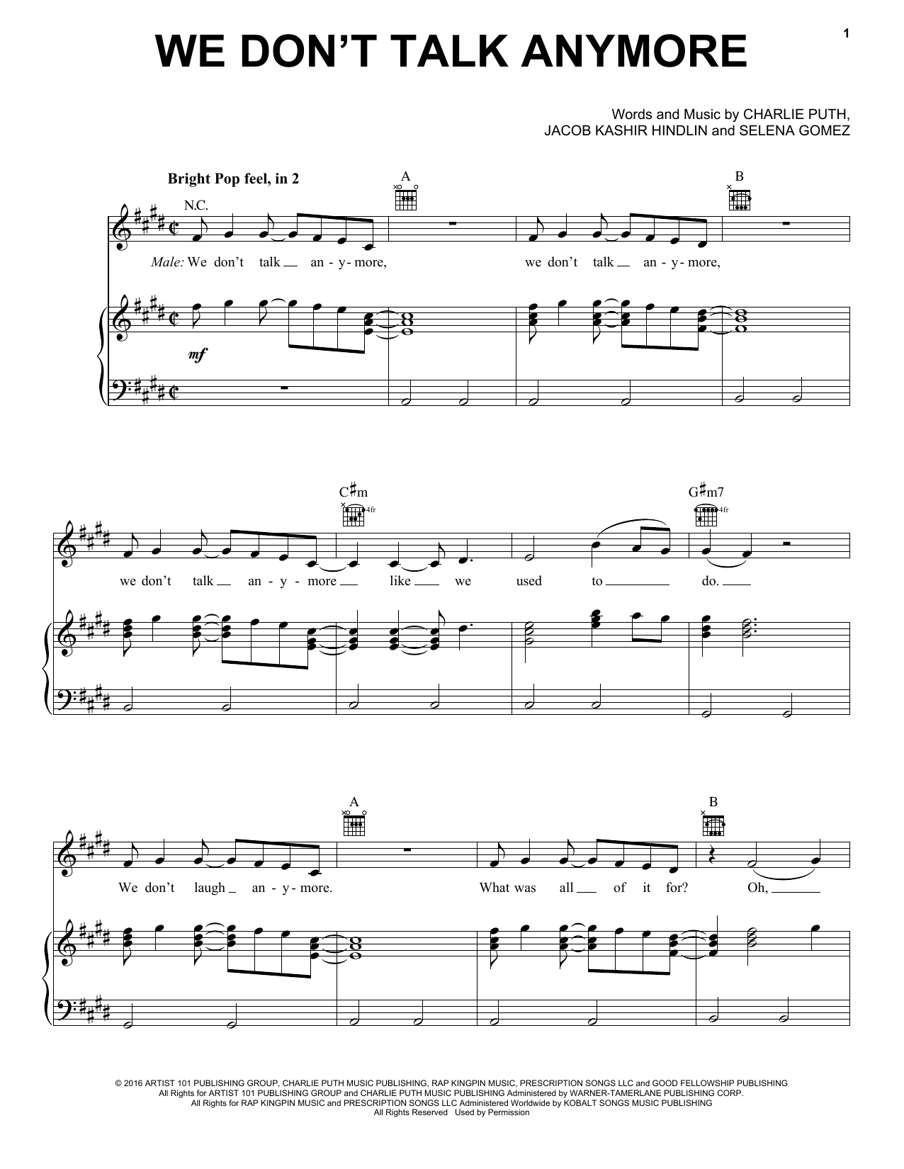 Download or print Charlie Puth feat. Selena Gomez We Don't Talk Anymore sheet music, chords and digital score arranged for Piano, Vocal & Guitar Chords (Right-Hand Melody). This Pop score includes 9 page(s).