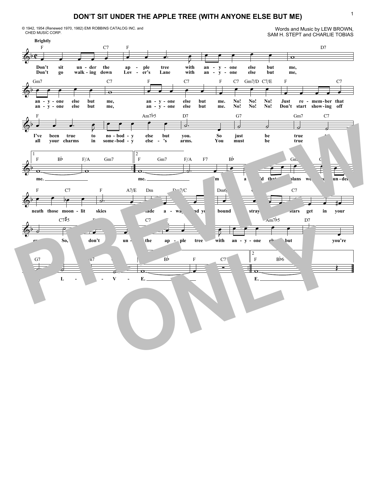 Download or print Charlie Tobias Don't Sit Under The Apple Tree (With Anyone Else But Me) sheet music, chords and digital score arranged for Easy Piano. This Jazz score includes 4 page(s).