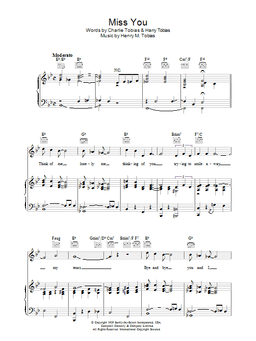 Download or print Charlie Tobias Miss You sheet music, chords and digital score arranged for Piano, Vocal & Guitar Chords. This Pop score includes 4 page(s).