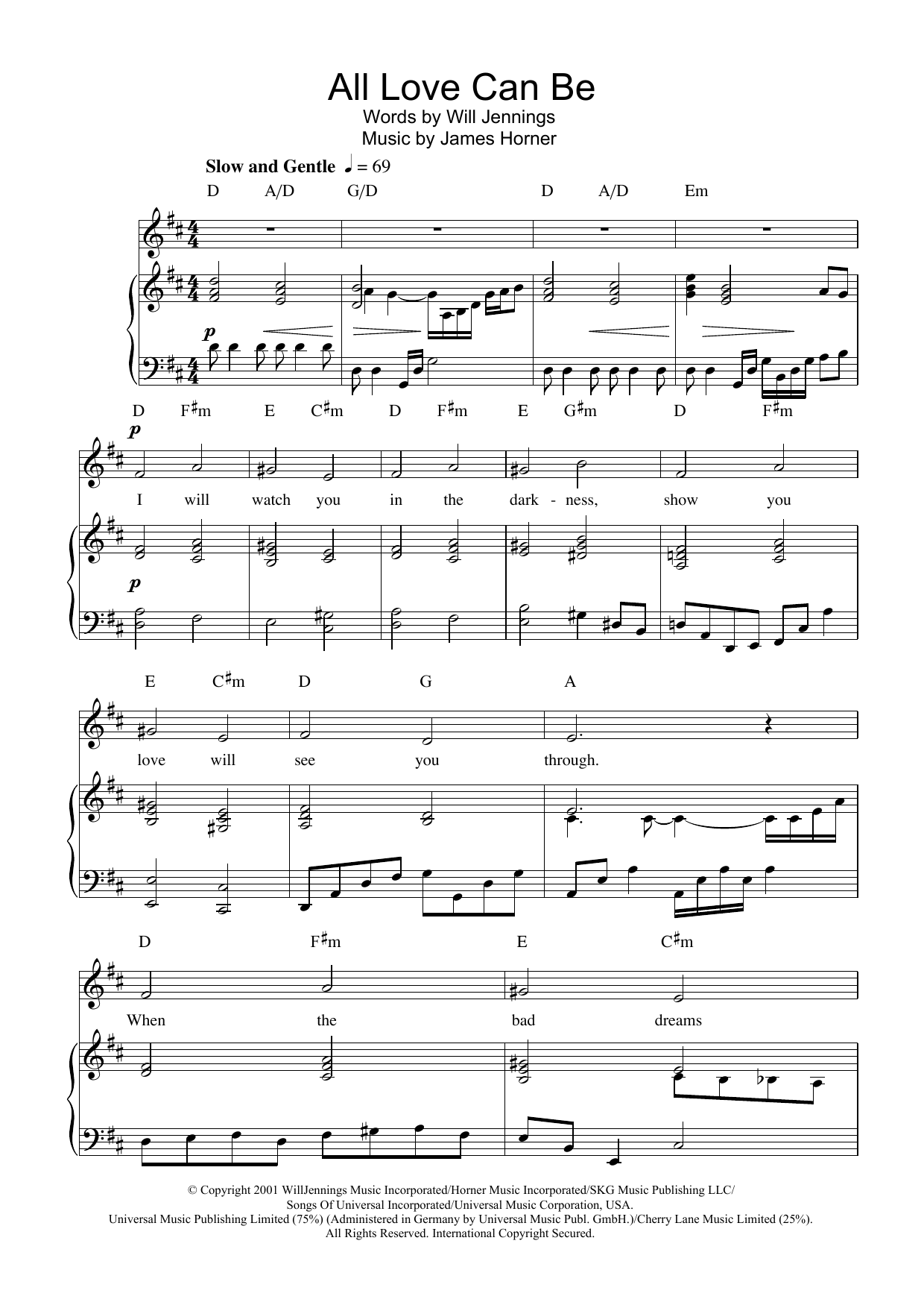 Download or print Charlotte Church All Love Can Be (from A Beautiful Mind) sheet music, chords and digital score arranged for Piano, Vocal & Guitar Chords. This Film/TV score includes 4 page(s).