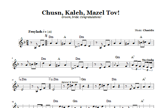 Download or print Chasidic Chusn, Kaleh, Mazal Tov! (Groom, Bride: Congratulations!) sheet music, chords and digital score arranged for Lead Sheet / Fake Book. This Traditional score includes 1 page(s).