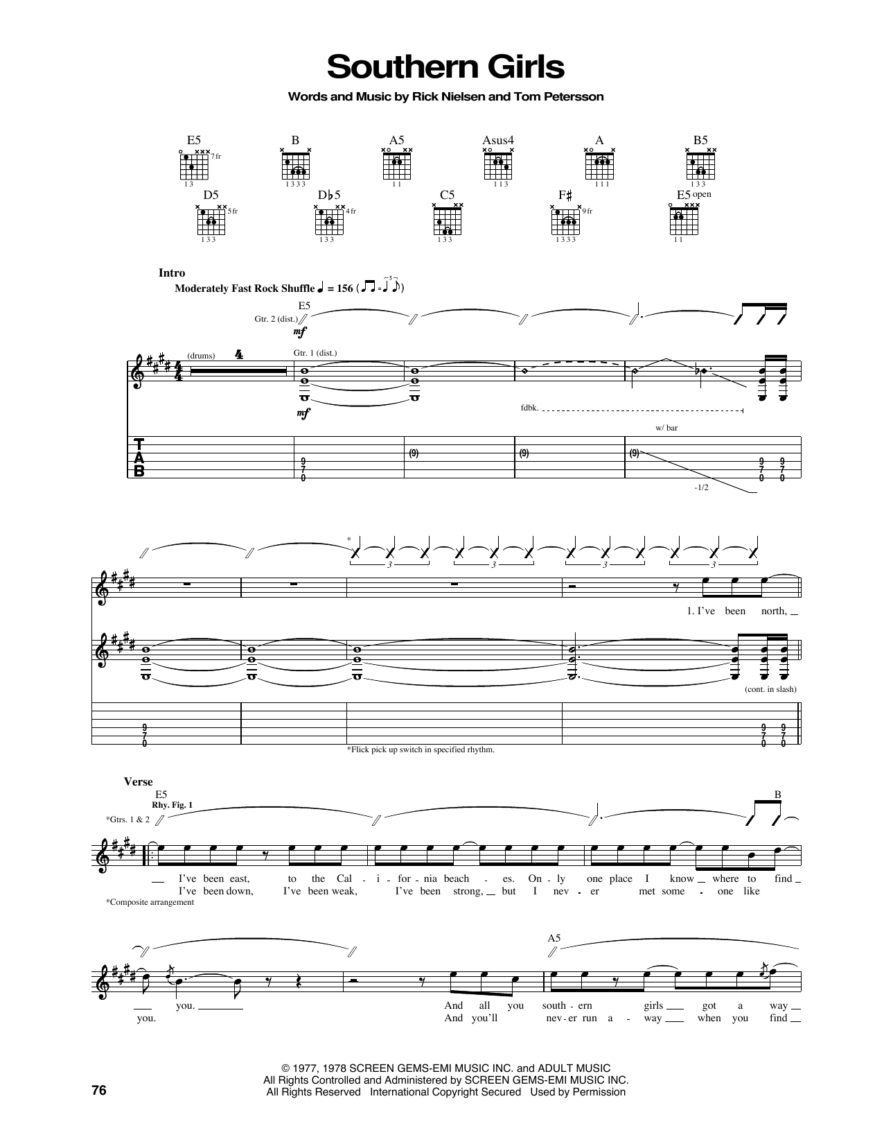 Download or print Cheap Trick Southern Girls sheet music, chords and digital score arranged for Guitar Tab. This Pop score includes 4 page(s).