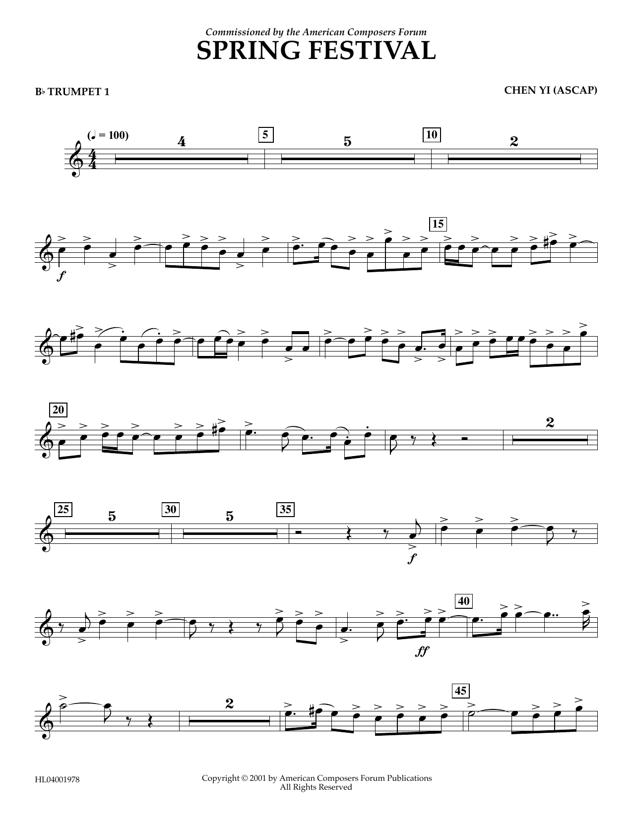Download or print Chen Yi Spring Festival - Bb Trumpet 1 sheet music, chords and digital score arranged for Concert Band. This Concert score includes 2 page(s).