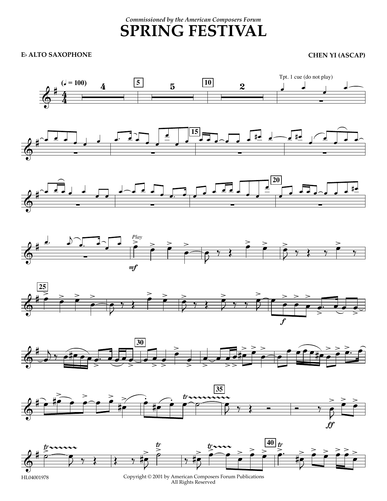 Download or print Chen Yi Spring Festival - Eb Alto Saxophone sheet music, chords and digital score arranged for Concert Band. This Concert score includes 2 page(s).