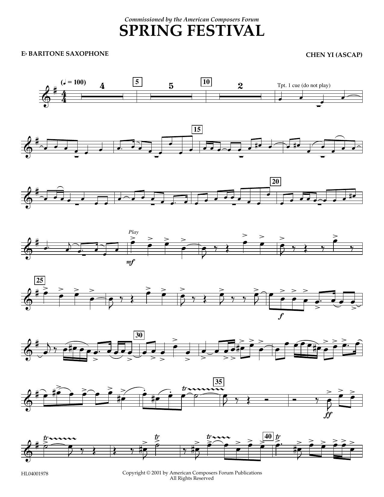 Download or print Chen Yi Spring Festival - Eb Baritone Saxophone sheet music, chords and digital score arranged for Concert Band. This Concert score includes 2 page(s).