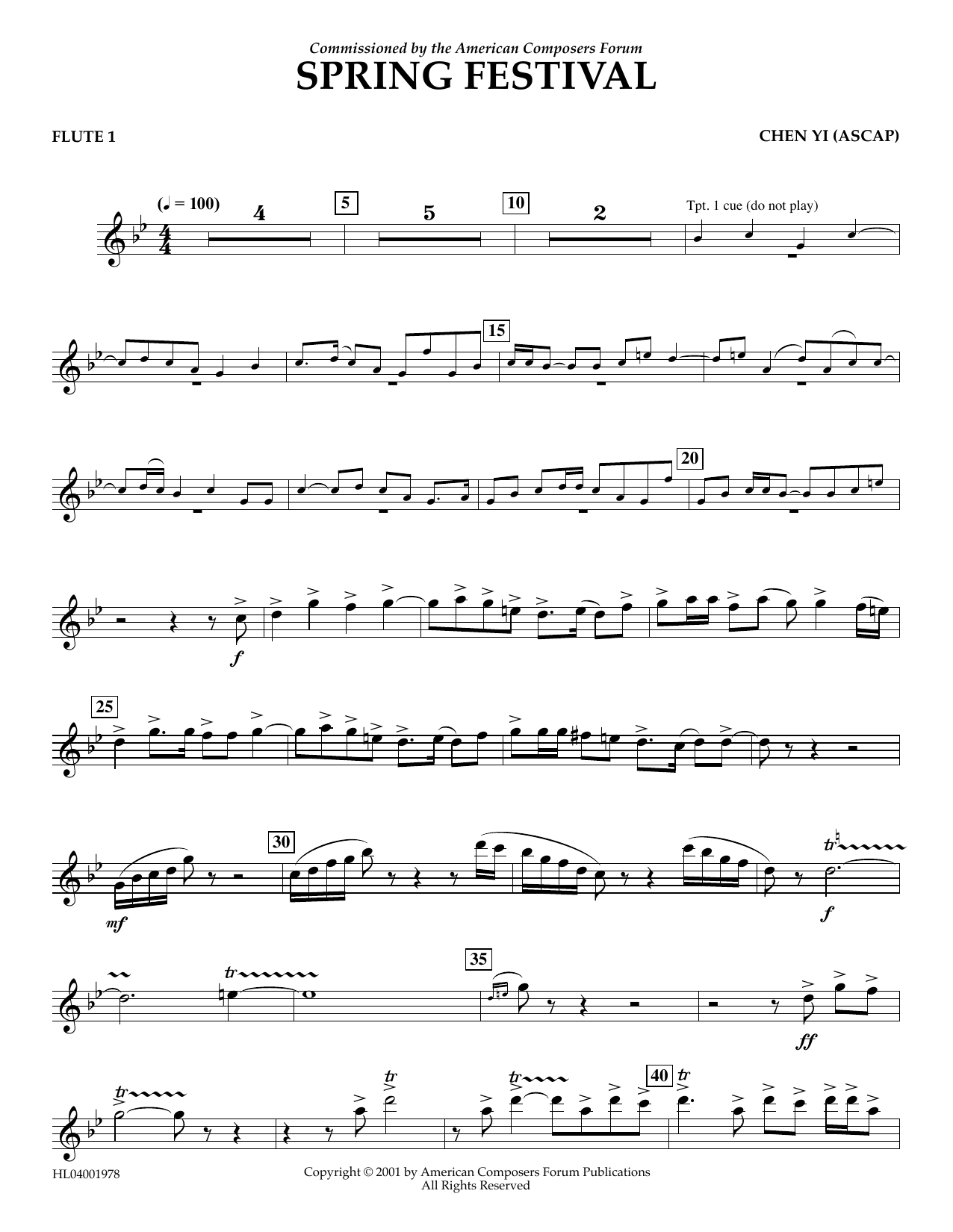Download or print Chen Yi Spring Festival - Flute 1 sheet music, chords and digital score arranged for Concert Band. This Concert score includes 2 page(s).